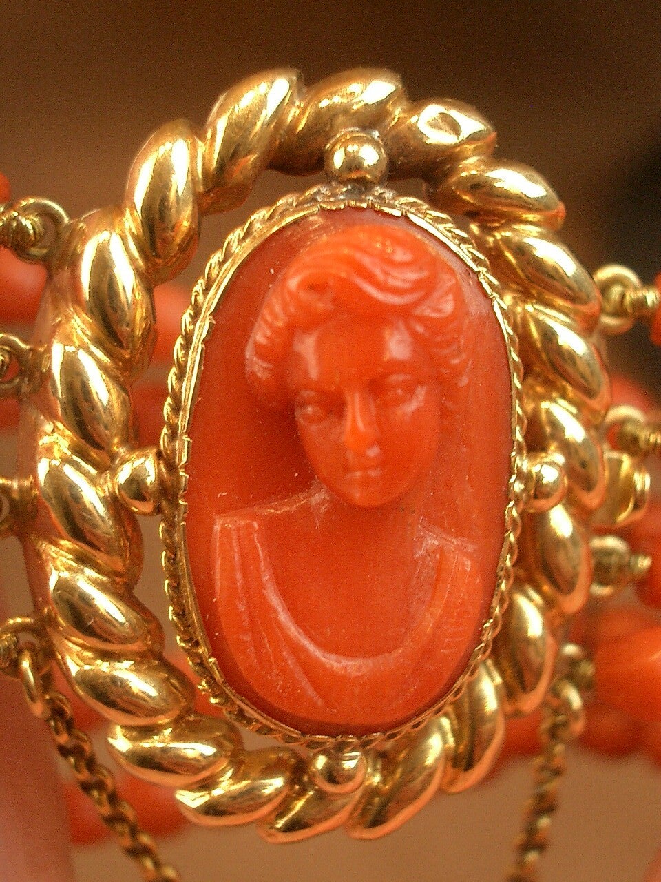 Superbe Bracelet à 4 rangs de perles de corail, fermoir en or 18k orné d'un camée en corail