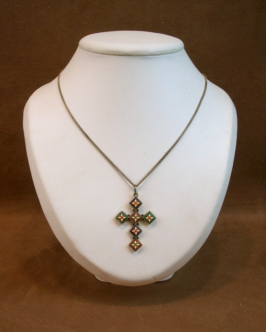 Bel ancien pendentif croix en vermeil et émaux bressans avec sa chaine en argent massif