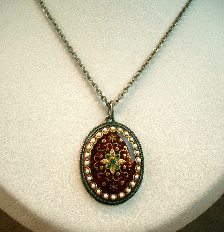 Bel ancien pendentif en argent massif et émaux bressans fond rouge