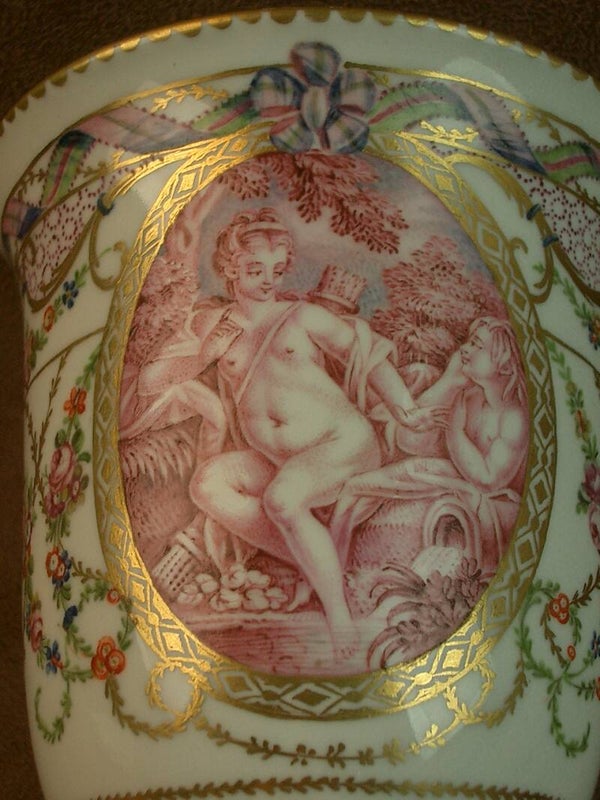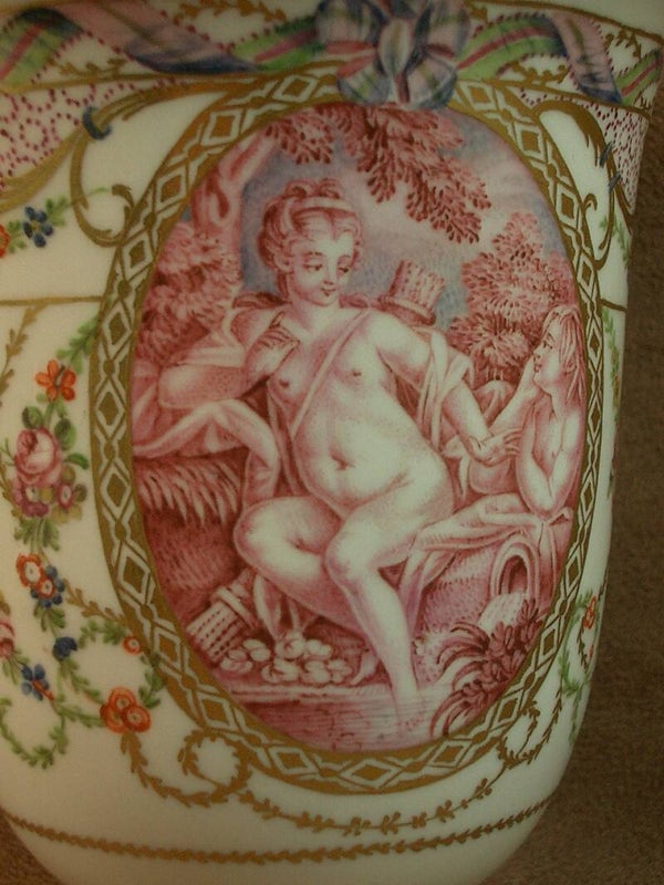Il présente un superbe médaillon cerné de dorure , peint en camaieu rose, d'une scène mythologique, vraisemblablement Diane châsseresse.