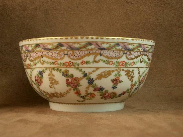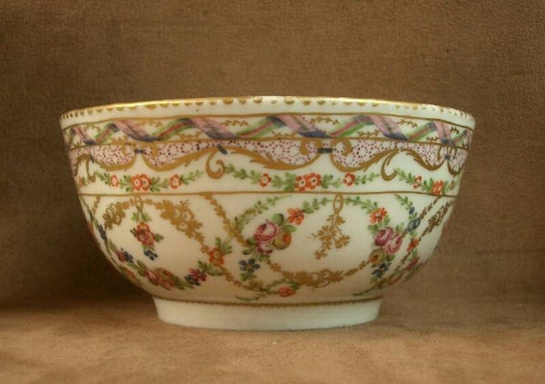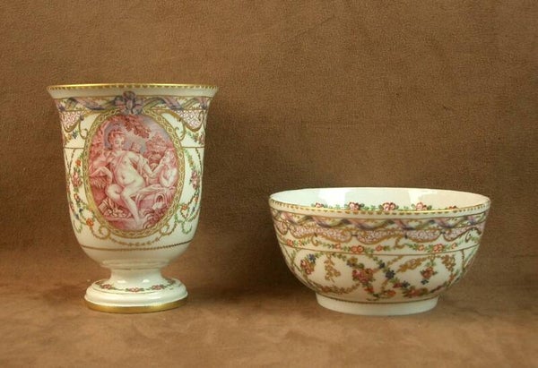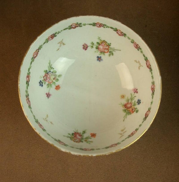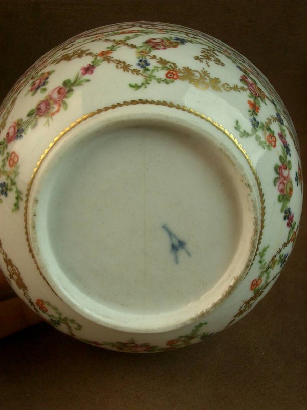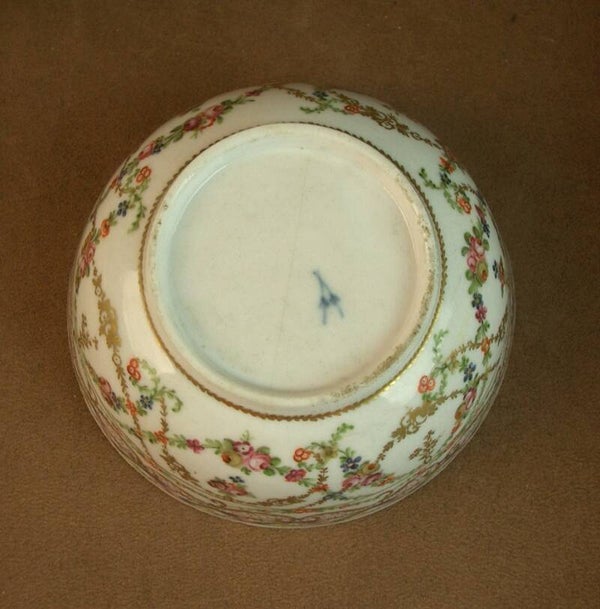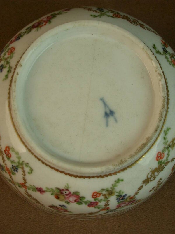 Il ne porte pas de marque, je joins avec le bol accidenté au décor similaire (sans médaillon) qui lui porte la marque de la manufacture de Locré aux deux torches.