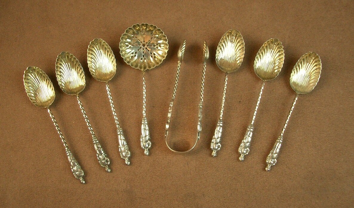 Composé de 6 petites cuillères, un passe thé et une pince à sucre.
