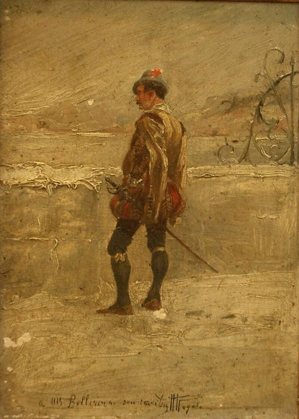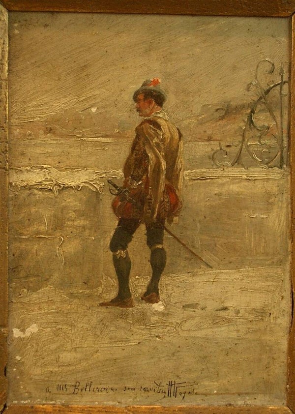 Belle petite peinture du XIXe siècle, Portrait de gentilhomme à l'épée, paysage enneigé