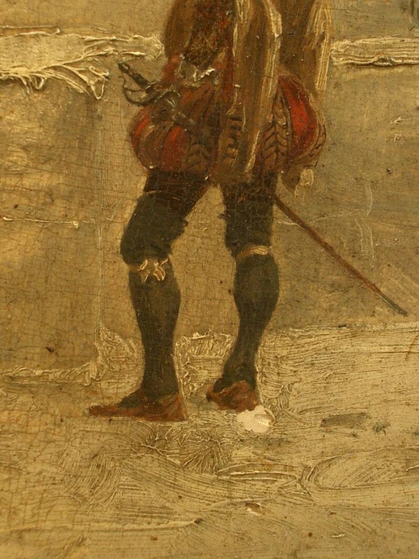Belle petite peinture du XIXe siècle, Portrait de gentilhomme à l'épée, dans un paysage enneigé sur un panneau de bois