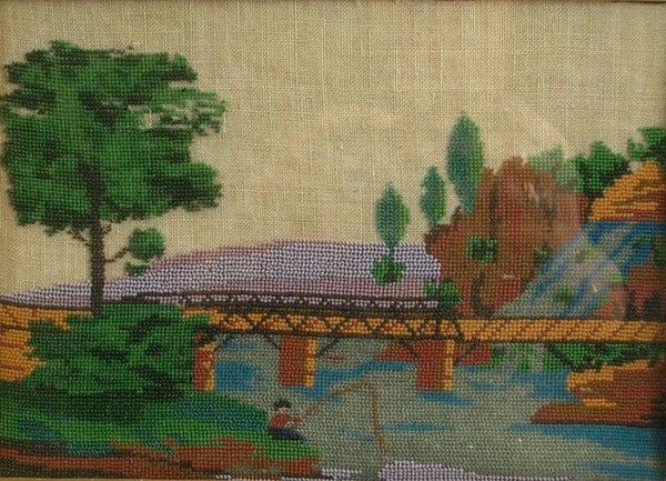 Beau travail de perles, broderie, sablé , Paysage rivière et pêcheur XIXe siècle