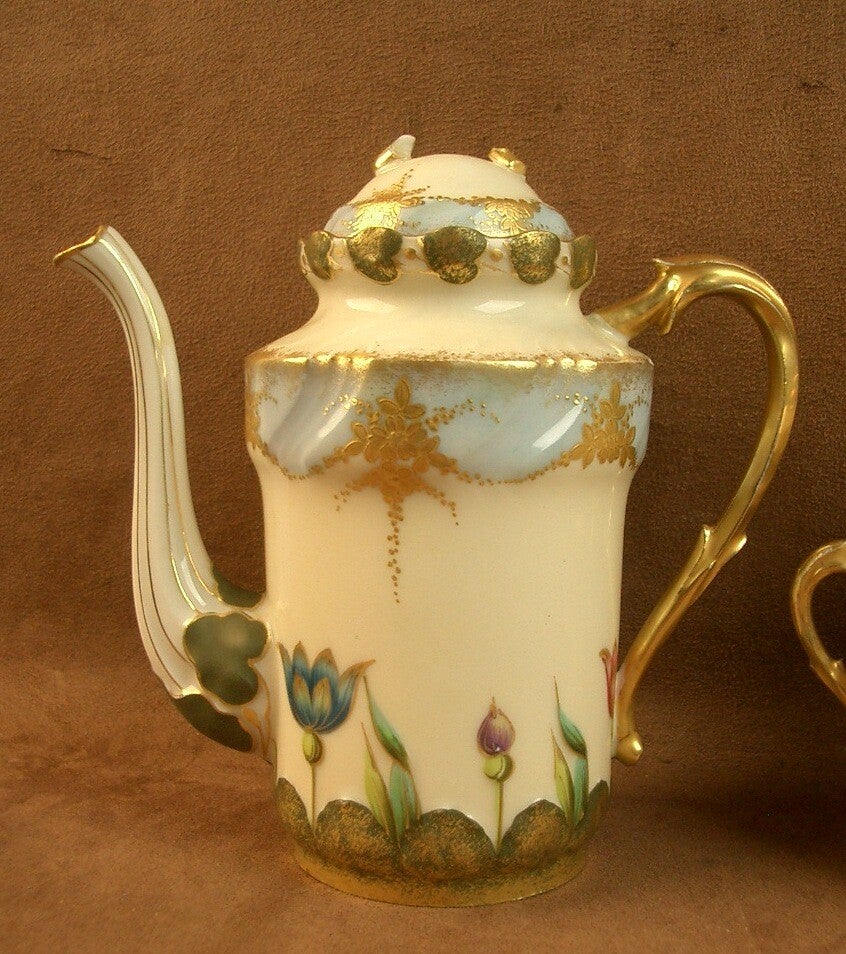 Sublime service à thé ou café, tête à tête en porcelaine de Limoges Art Nouveau de la manufacture Bac et Périgault active entre 1874 et 1897