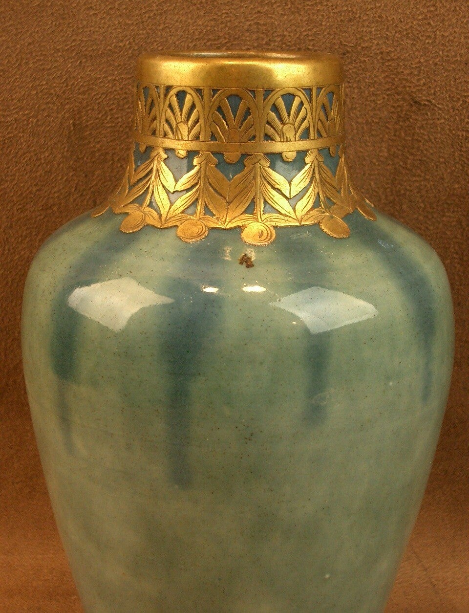 Beau vase Art Nouveau en porcelaine et ornements en métal doré