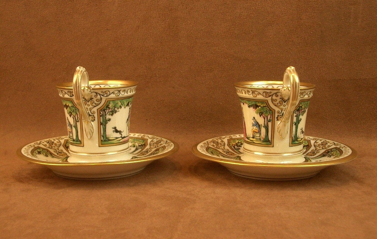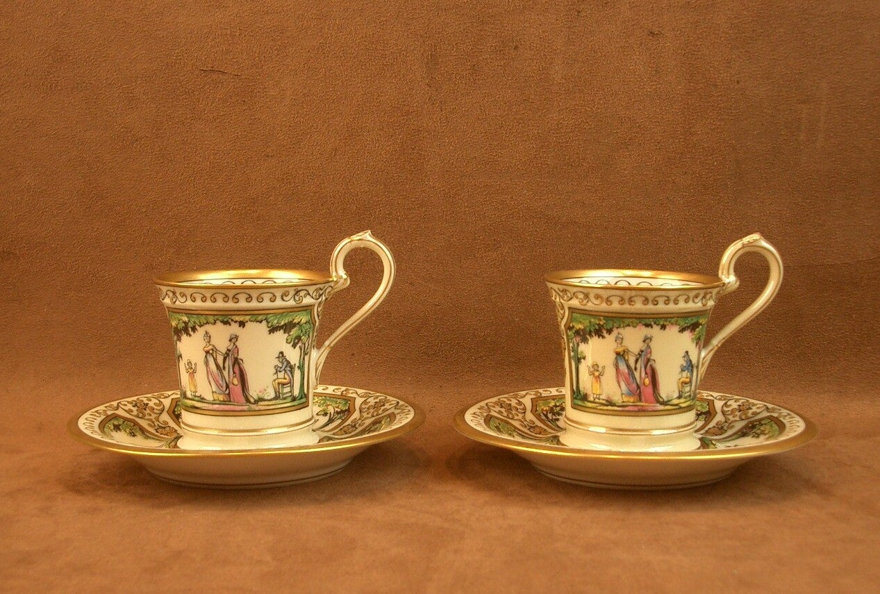 Deux tasses à café et leur sous-tasse en porcelaine de Limoges, Raynaud, Promenade Au Palais Royal