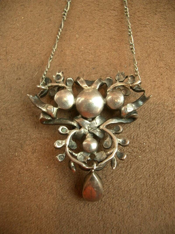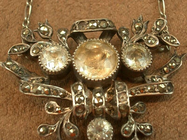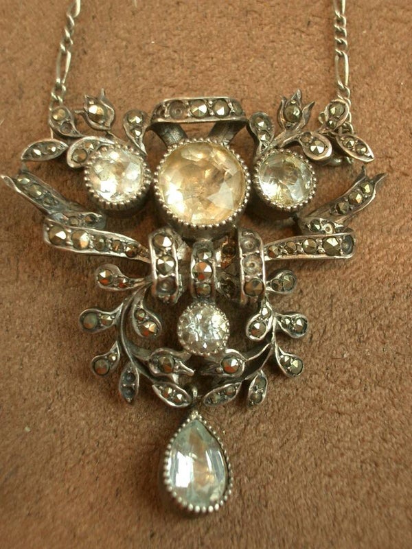 Ancien collier en argent massif , beau pendentif pierres du rhin et marcassites