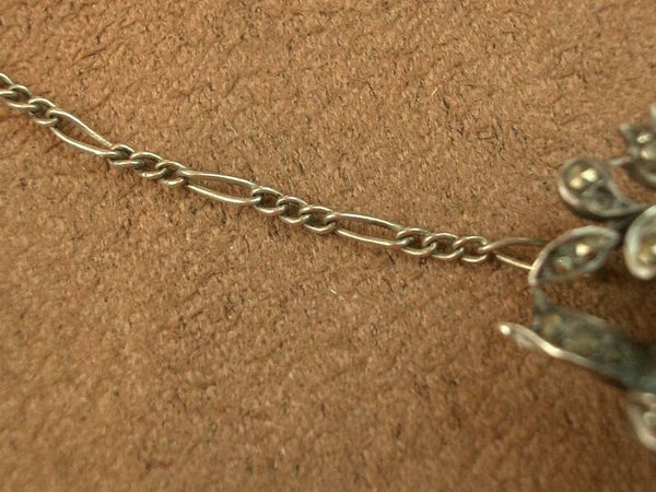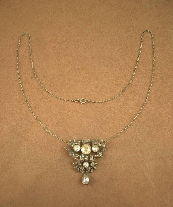 Ancien collier en argent massif , beau pendentif serti de pierres du rhin et marcassites.