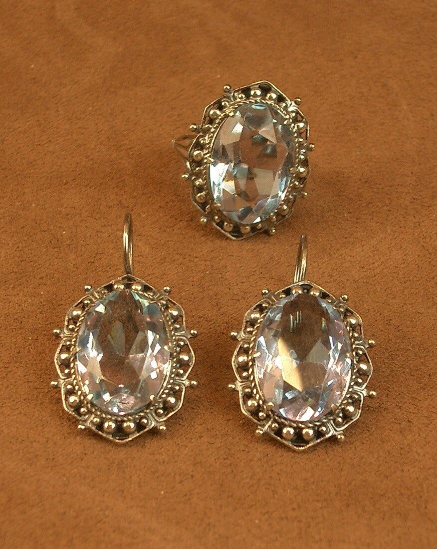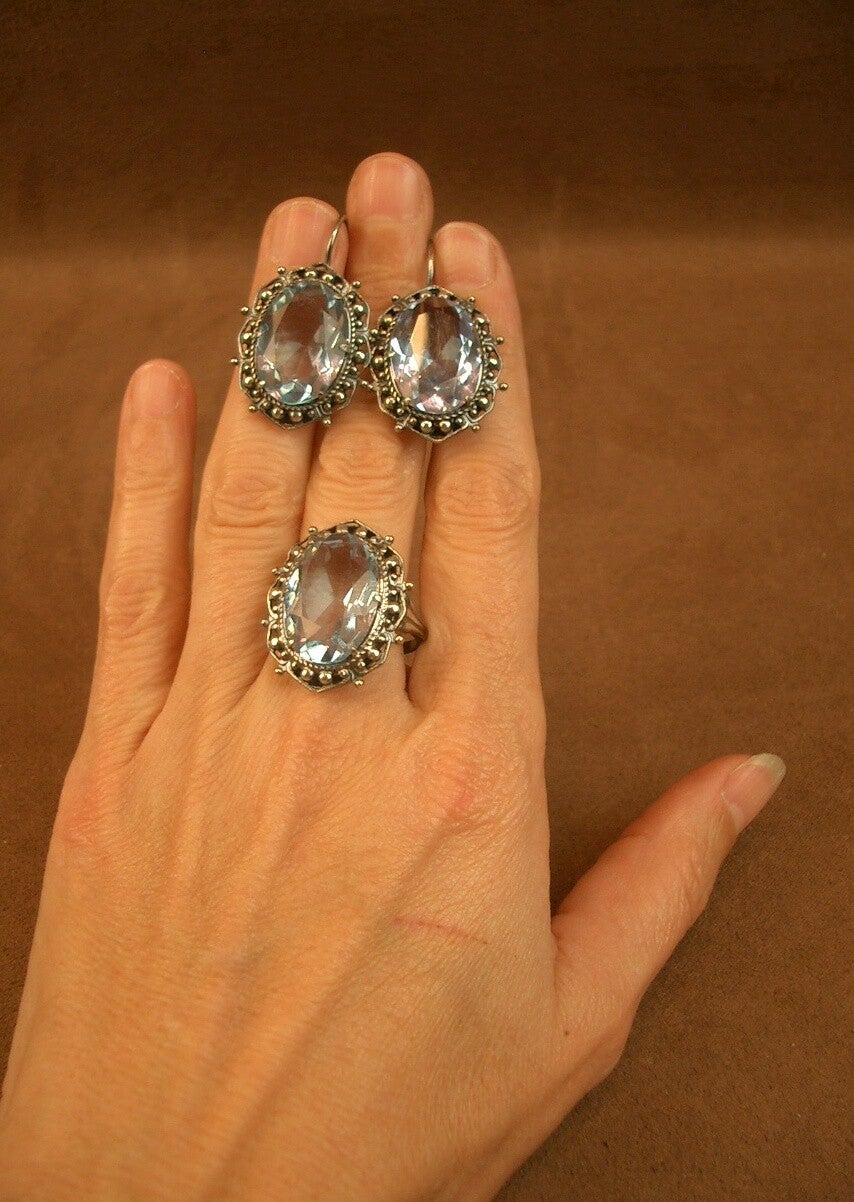 Belle demie parure de bijoux, bague et Boucles d'oreille assorties en argent et imposantes pierres bleues aux reflets mauve