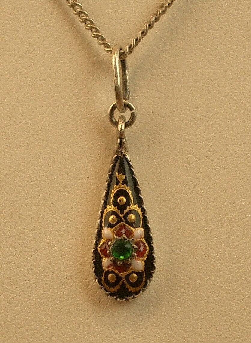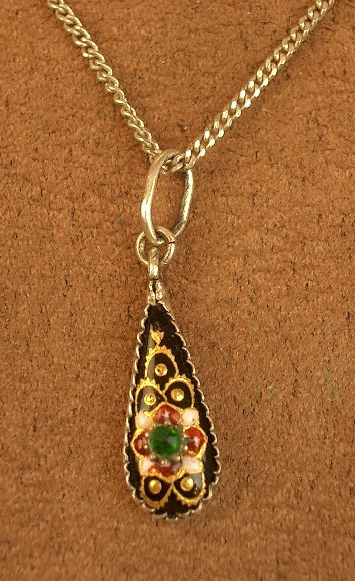 Bel ancien pendentif forme goutte en argent massif et émaux bressans sur fond émaillé noir