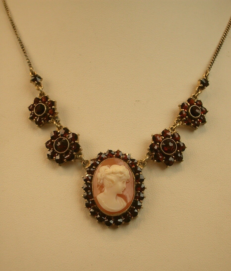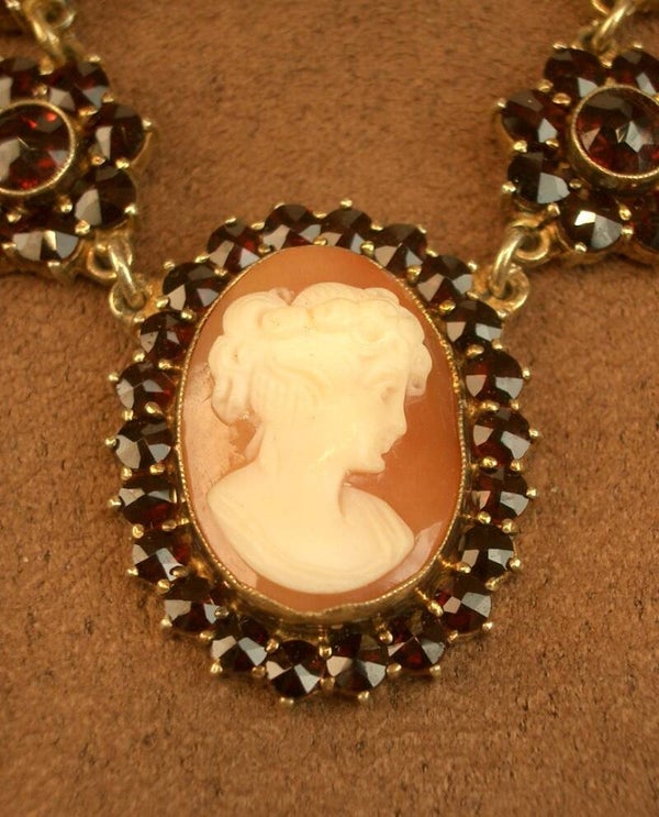 Collier ancien en vermeil , grenats de bohème formant motifs floraux et camée coquillage sculptée d'un profil féminin