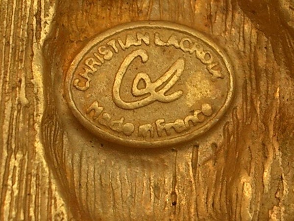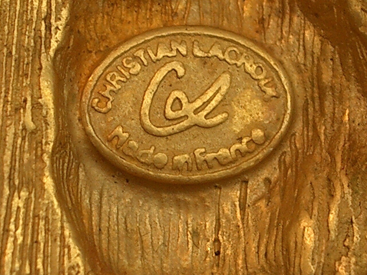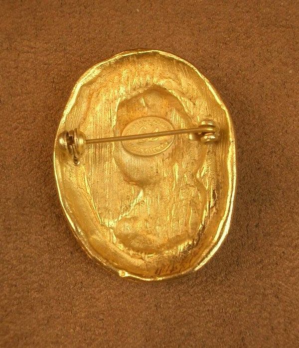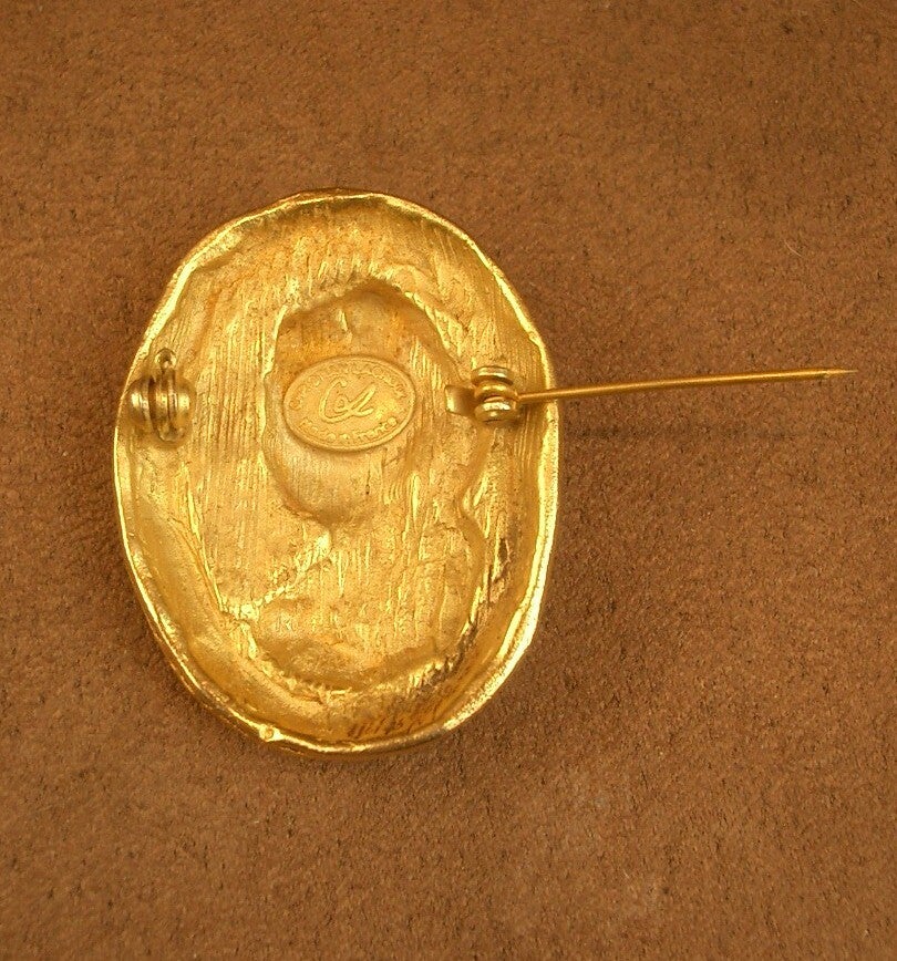 Belle broche vintage en métal doré signée Christian Lacroix, femme à l'antique façon camée