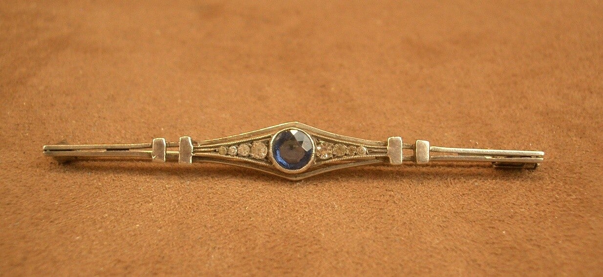 Longue broche barette Art Déco en argent massif et pierres, une pierre centrale bleue épaulée de petites pierres blanches