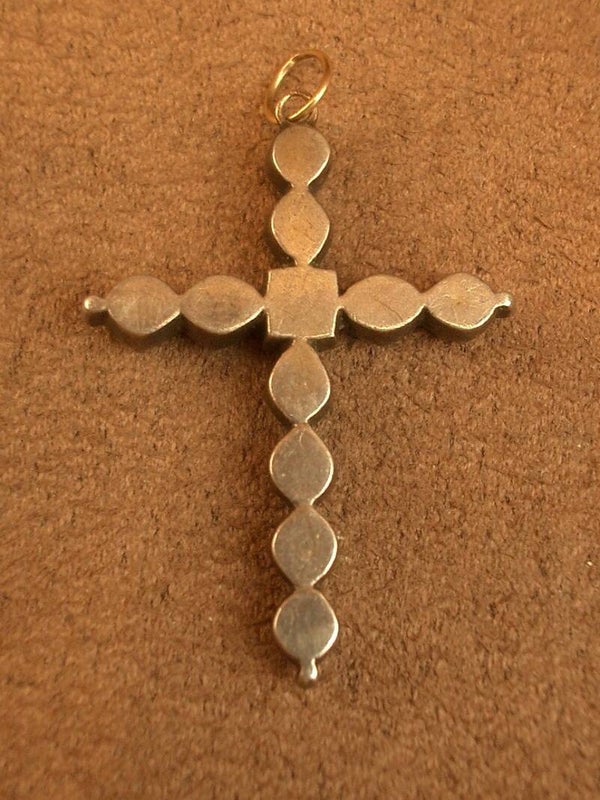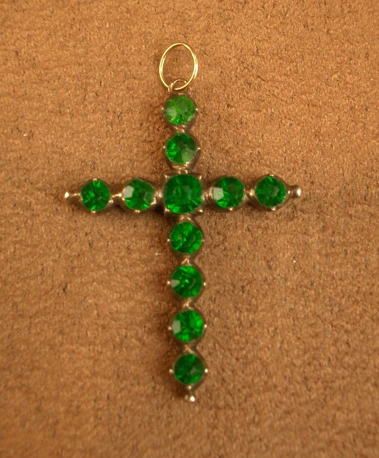 Pendentif ancien, croix en argent et vermeil sertie de pierres vertes XIXe siècle