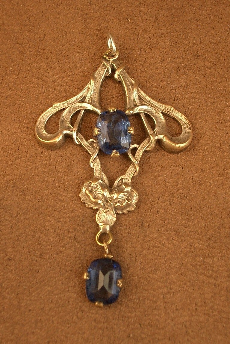 Pendentif Art Nouveau en métal argenté et pierres bleues