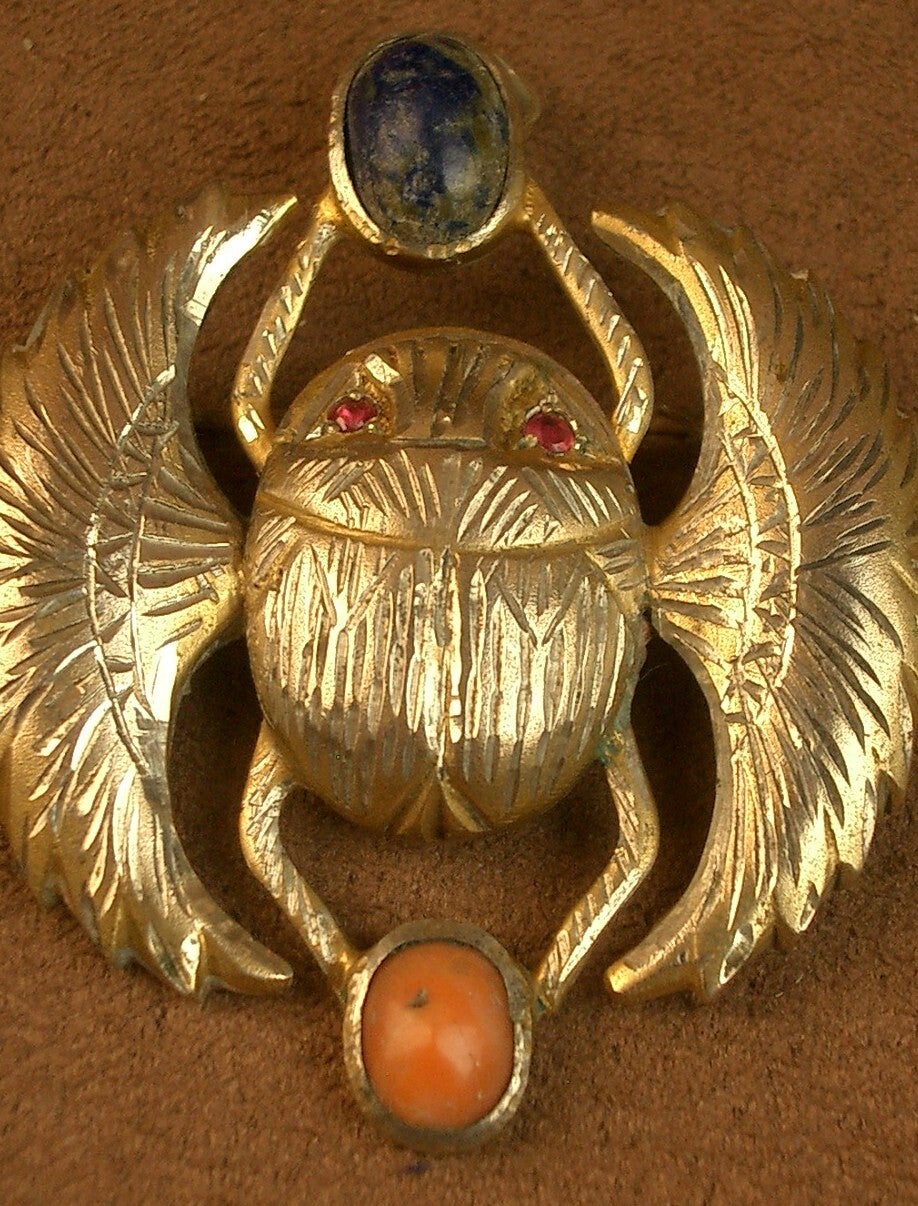 Importante broche ou pendentif ancien scarabée en vermeil corail et lapis lazuli