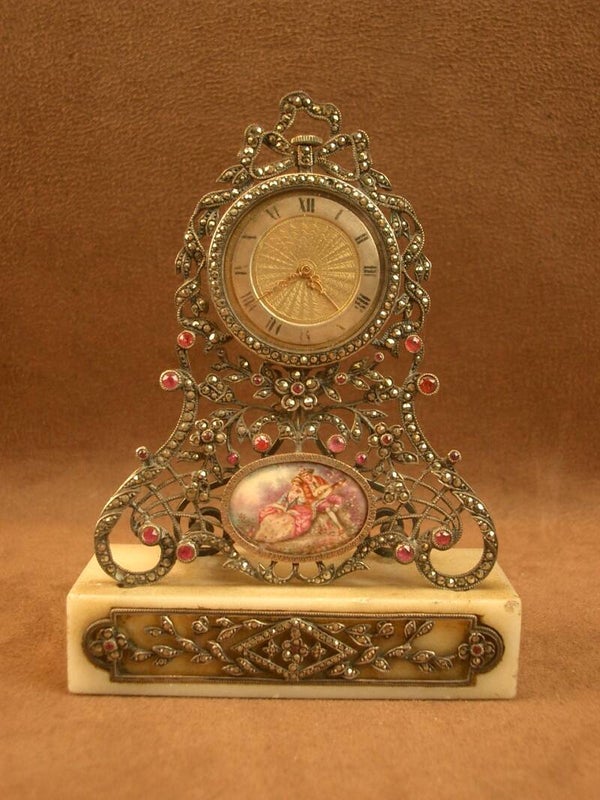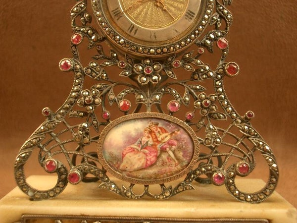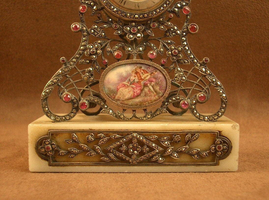 Sublime pendulette en argent massif , pierres semi-précieuses et miniature émaillée sur cuivre à décor d'une scène galante, sur un socle en albâtre.